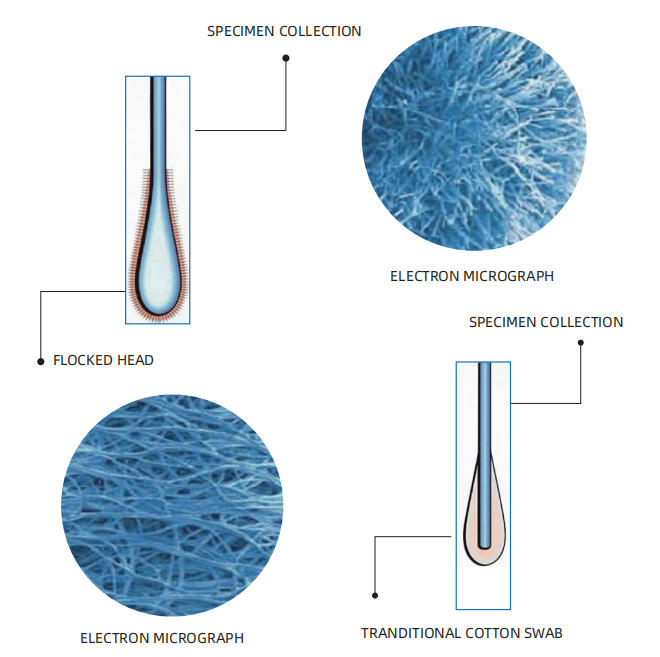 Unlike traditional swabs that consist of a “wad” of cotton or synthetic fiber wrapped around the tip of an applicator, a flocked swab features a spray-on technology.
